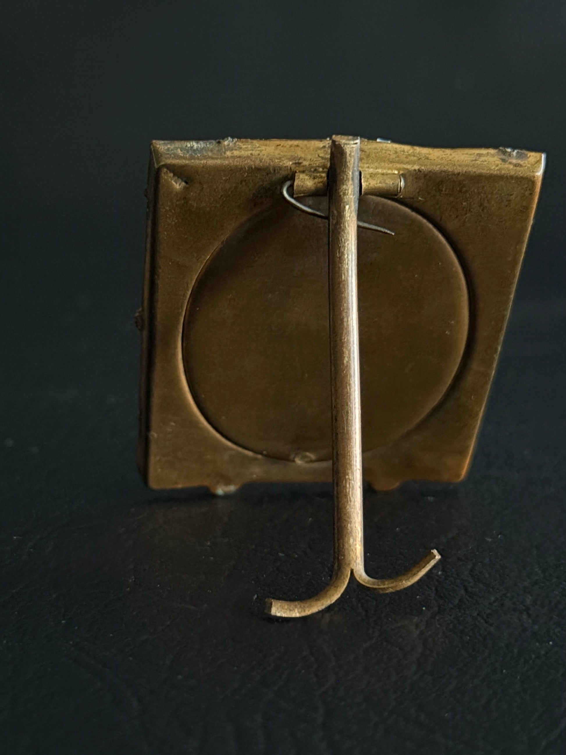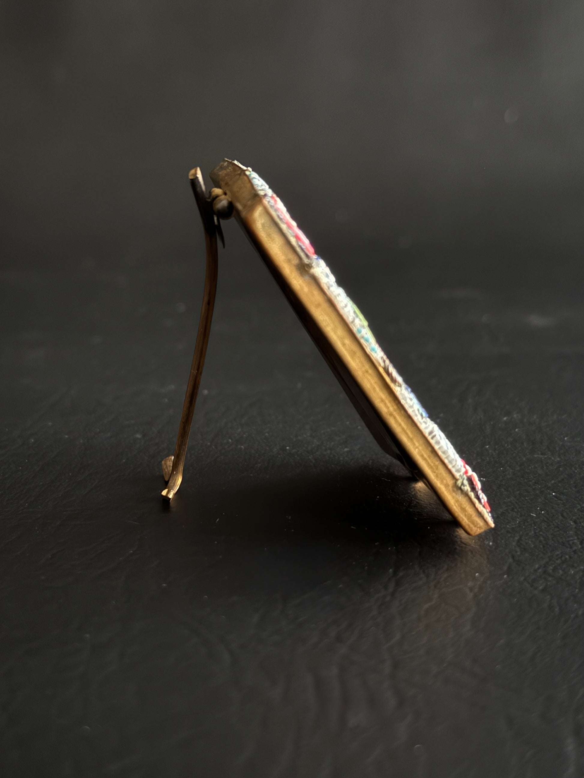 Antique Italian micromosaic mini frame with an oval opening, decorated with colorful glass tesserae in floral and geometric motifs. The mosaic surface shows age and wear consistent with its delicacy and use over time. Due to a loose kickstand, this piece is best suited for use as a hanging frame or decorative ornament rather than freestanding display.