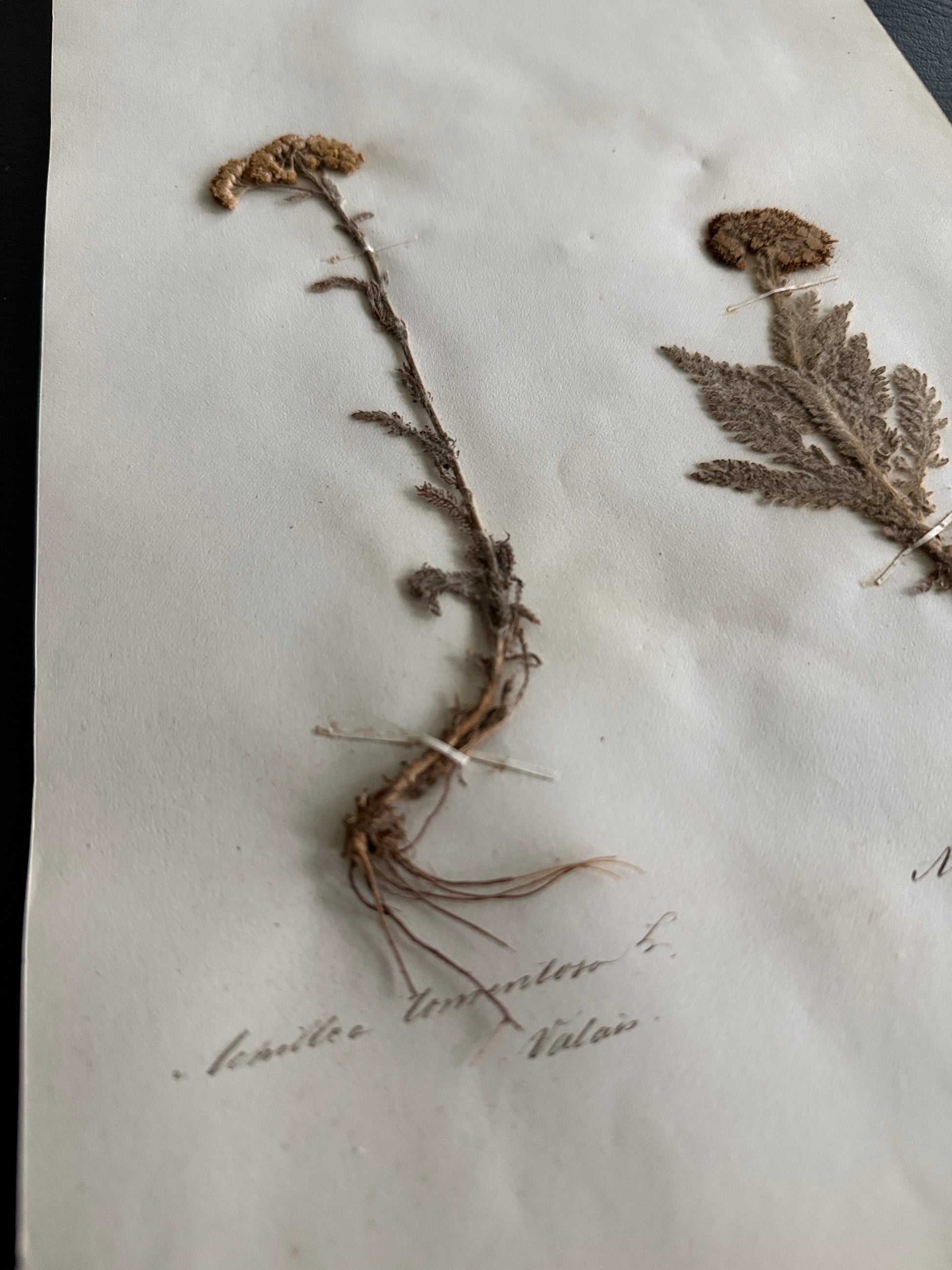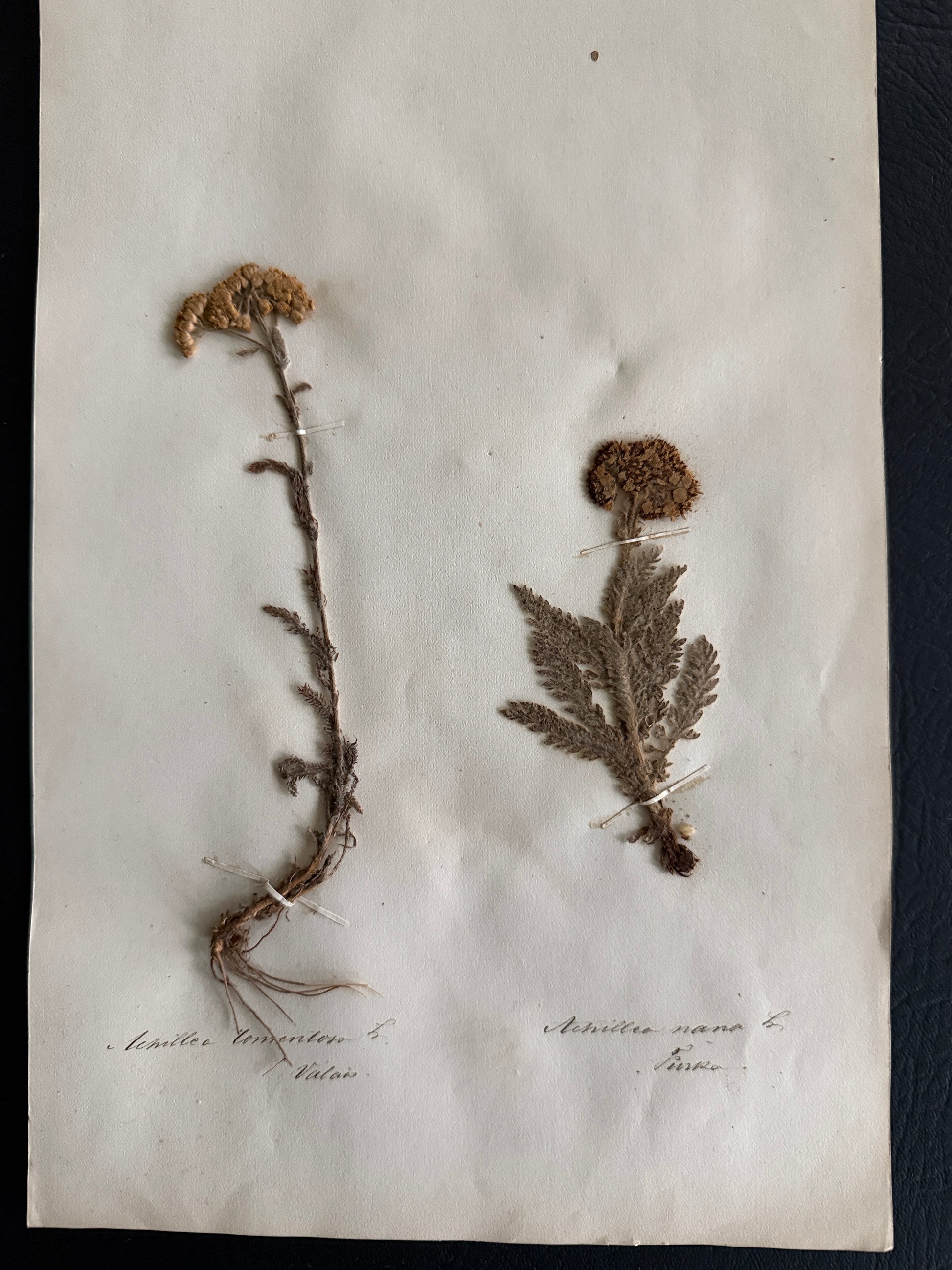 A 19th-century herbarium sheet featuring two pressed Achillea specimens—Achillea tomentosa L. (Valais) and Achillea nana L. (Tirano)—collected and mounted in 1863. Both are alpine members of the yarrow family, prized in their era for their medicinal and symbolic associations with healing and endurance.