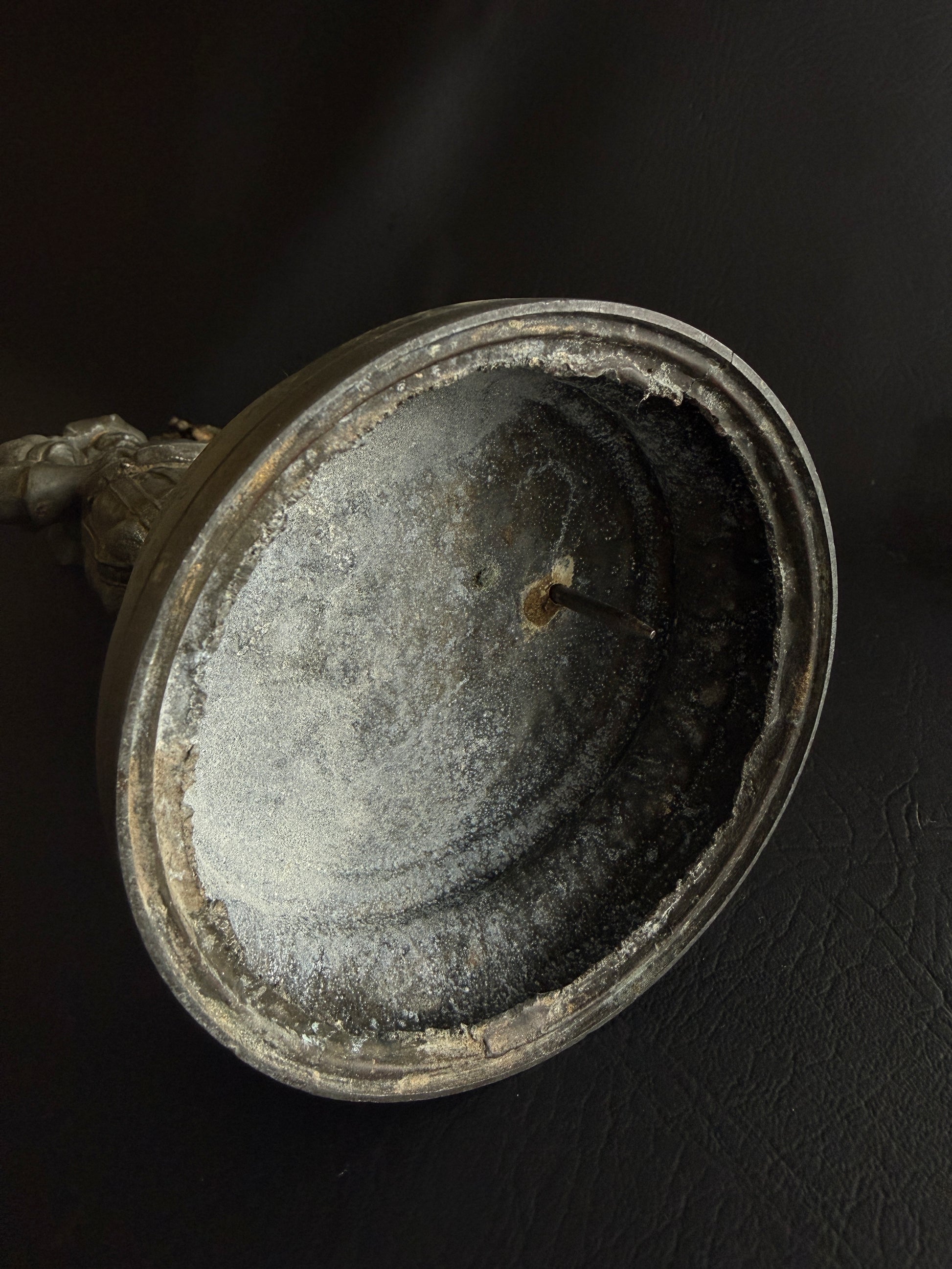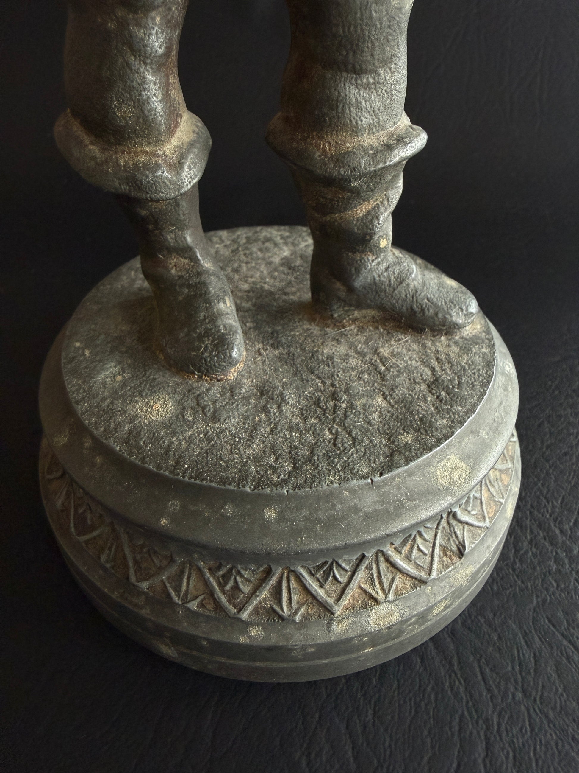 Age wear consistent with antique spelter. Small loss to decorative element at the top of the staff.