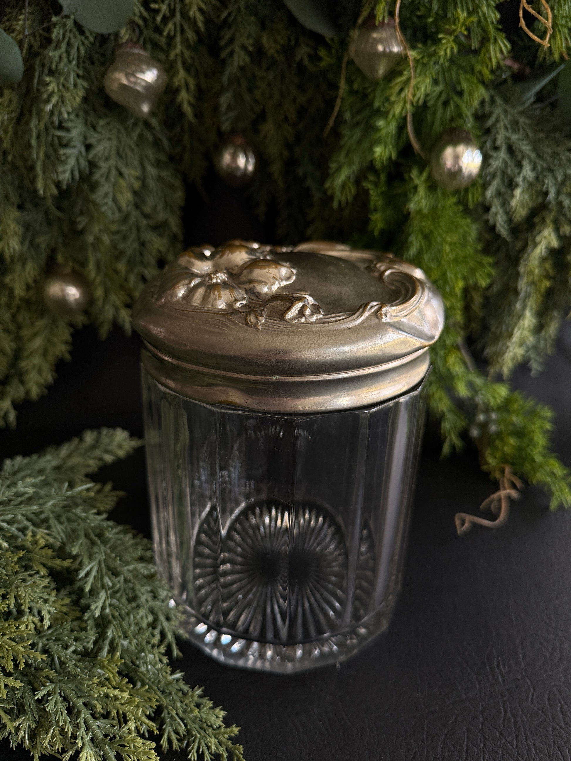 An elegant early 20th-century vanity jar featuring a pressed glass body and an ornate Art Nouveau lid draped in ribbon and floral relief. The silverplate top shows gentle dings from age, but still fits perfectly.