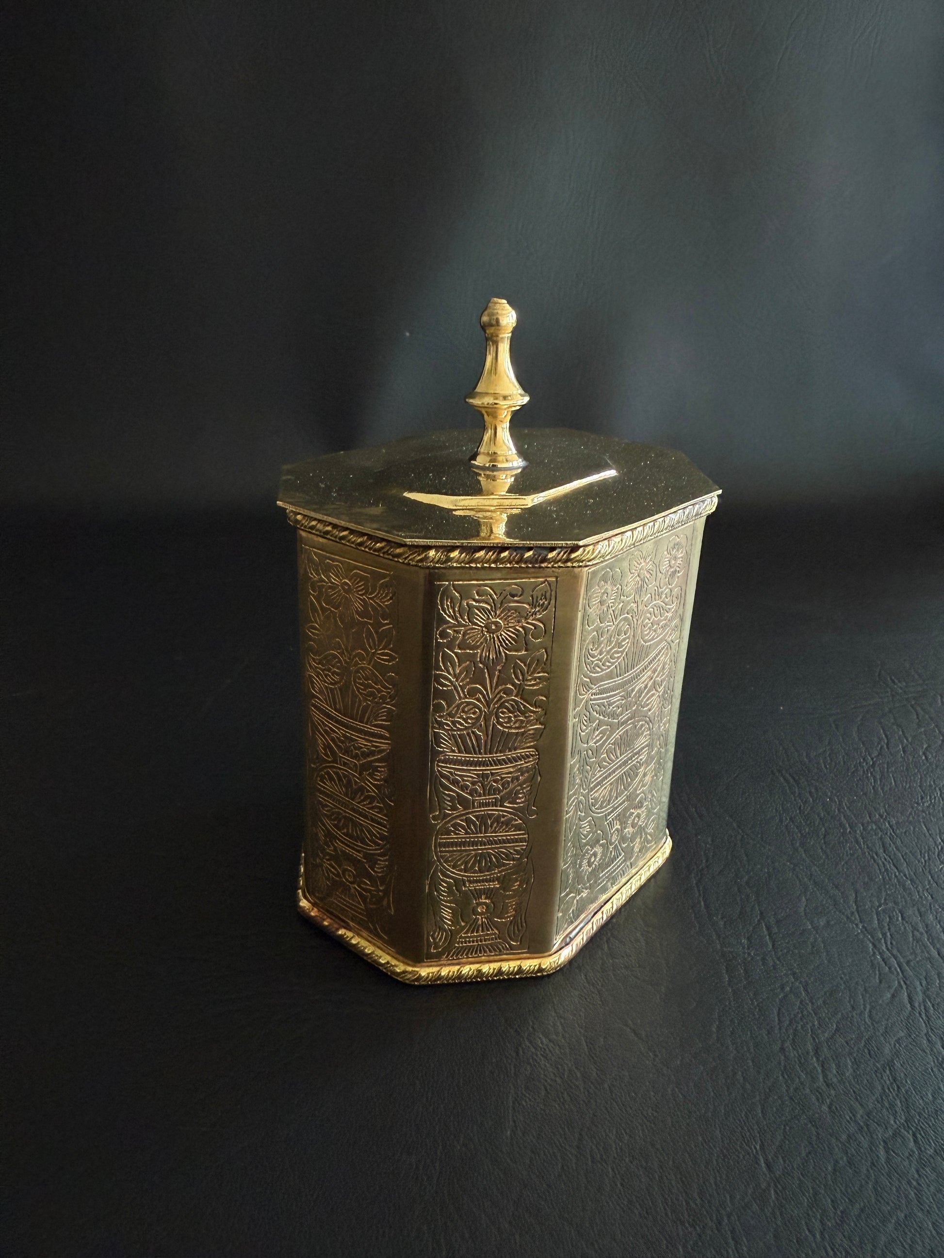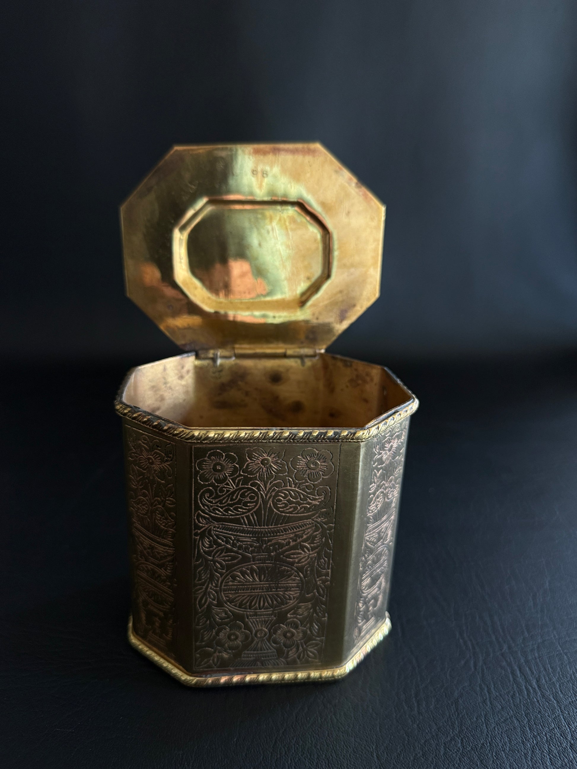 An octagonal brass tea caddy with beautifully hand-engraved urn and floral motifs and a hinged lid topped with a turned finial. The interior reveals a warm, time-earned patina—and in places, the brass shows faint pink undertones from the underlying copper, a telltale sign of age and authenticity.