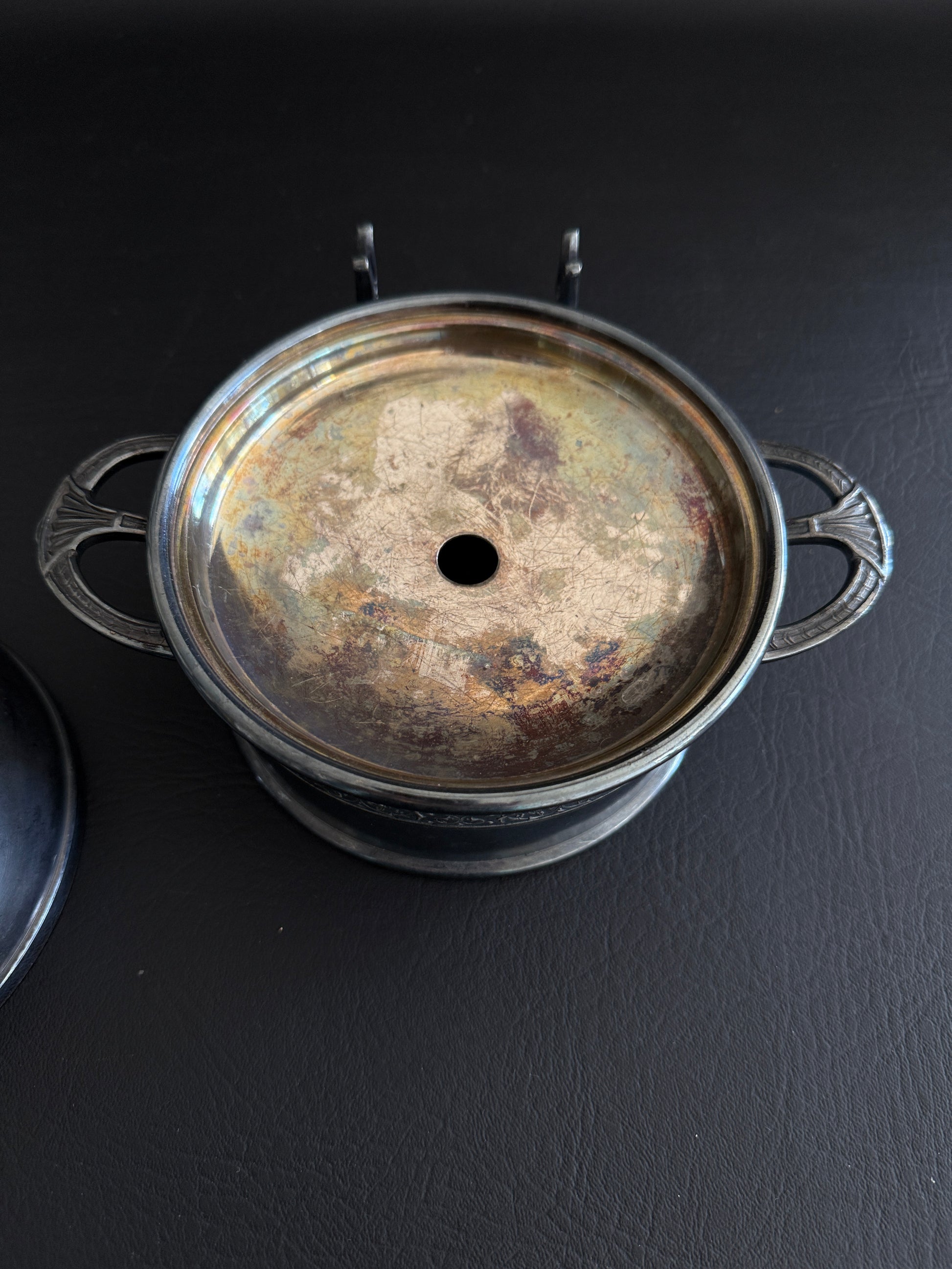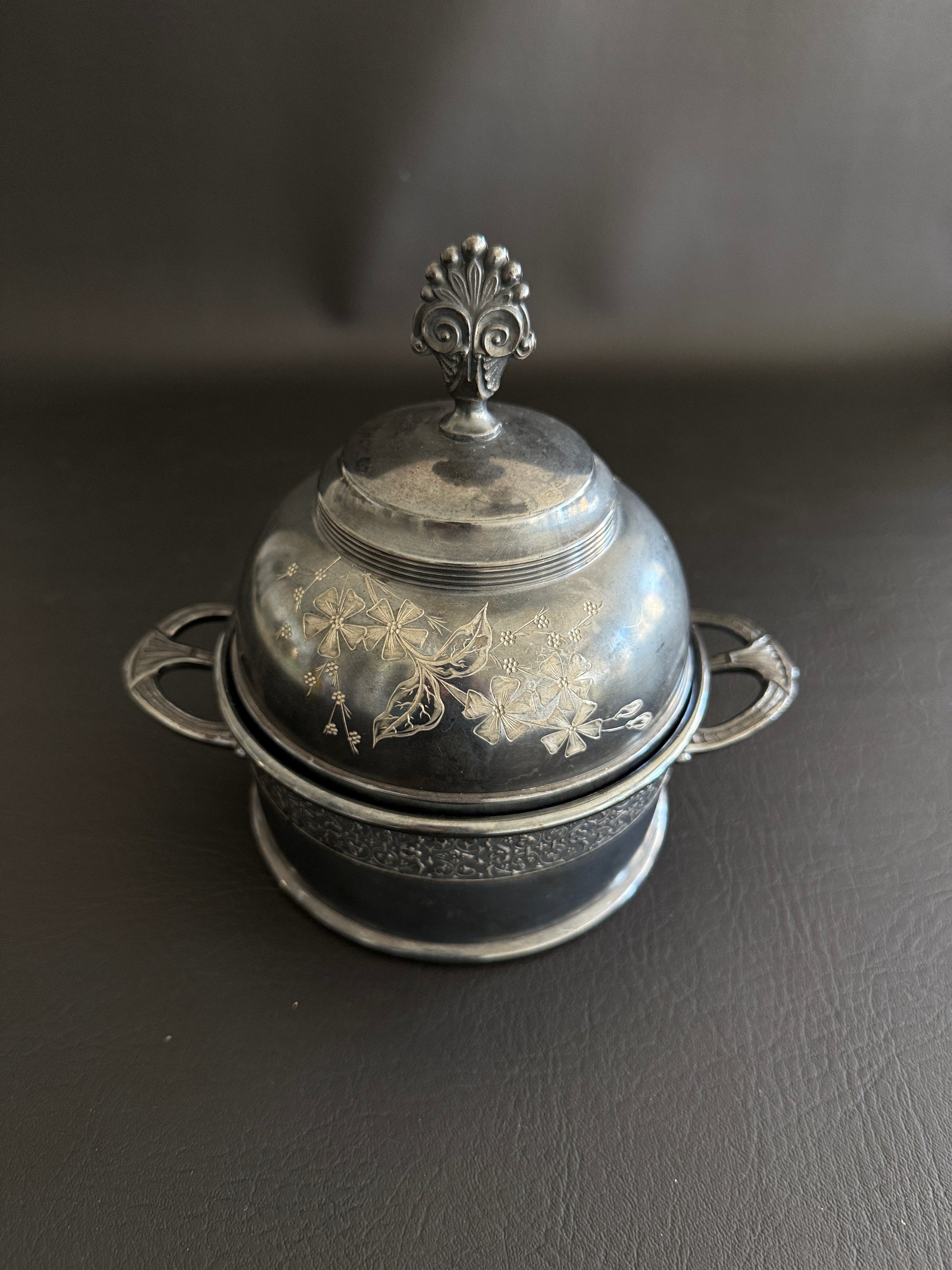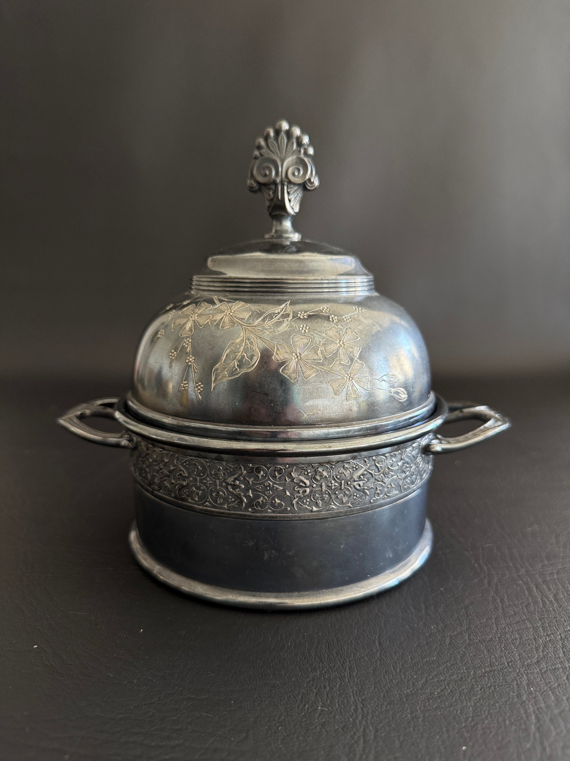 A 19th-century Southington Silver Co. covered vessel in richly engraved quadruple plate. The domed lid features botanical etching and a sculptural acanthus finial, while the base showcases a band of detailed repoussé scrollwork.